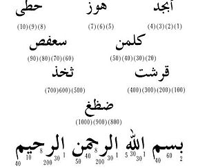 अलिफ़=1, बे=2, जीम=3, दाल=4, हे=5, वाओ=6, ज़े=7, बड़ी हे=8, तूए=9, ये=10